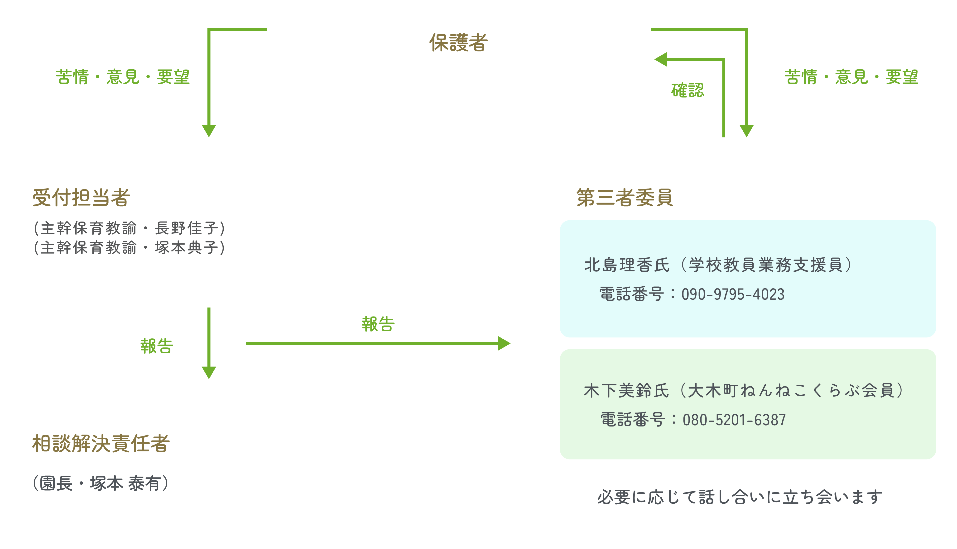なお、当保育園では、このようなご意見を聞くとき、従来通り職員の誰でもご意見を承りますが、一応、担当者と責任者をそれぞれ設けておりますので、下記の通りお知らせ致します。